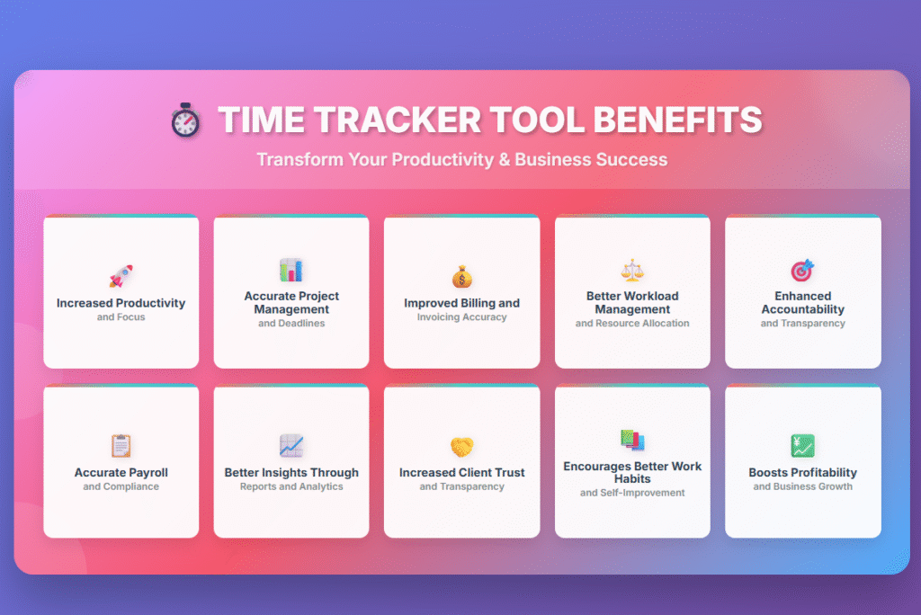 Time tracker tools improve productivity by showing exactly how work hours are spent. They reduce distractions, help prioritize tasks, and provide reports that highlight inefficiencies, so professionals can focus on high-value work.
